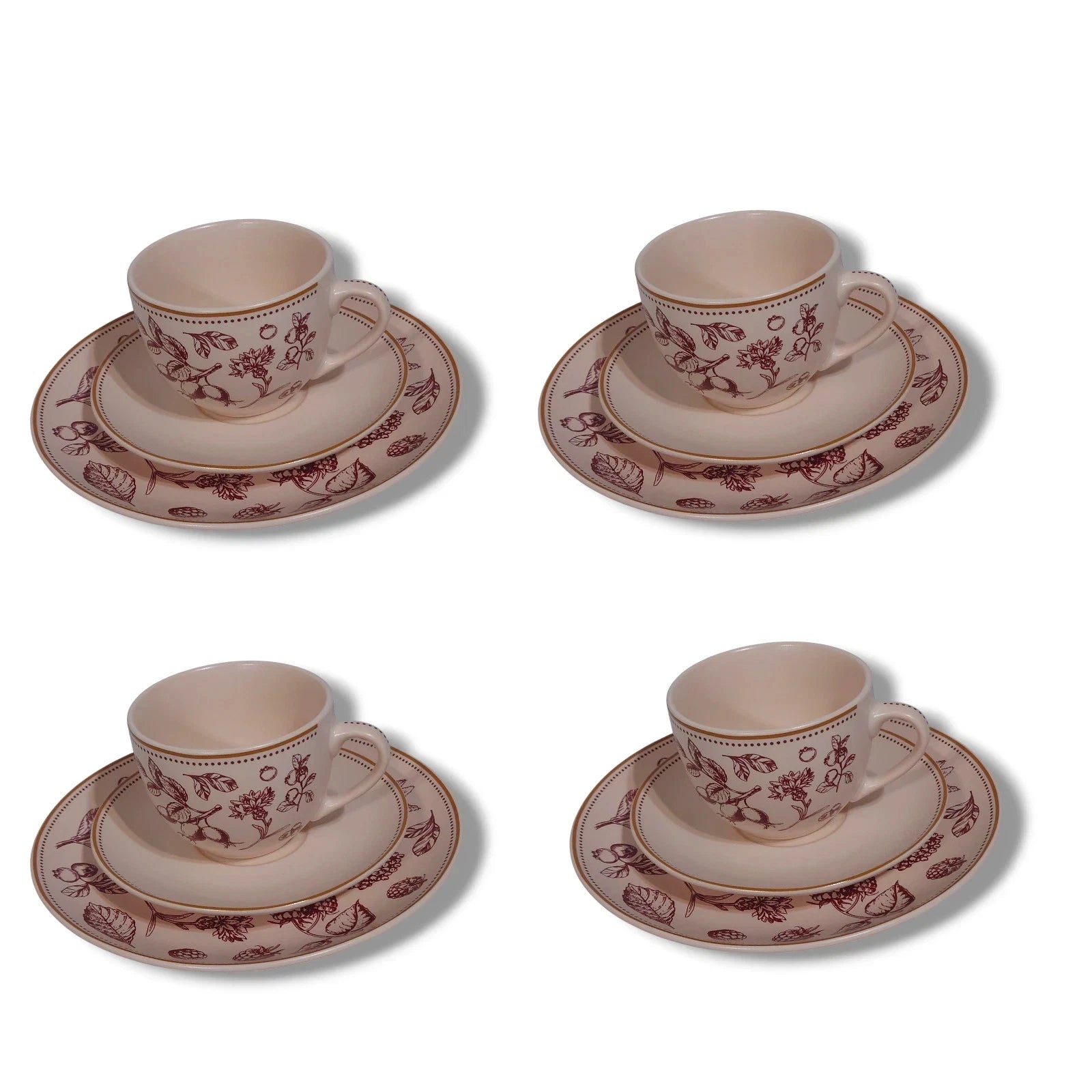 Dieses elegante 12-teilige Geschirrset überzeugt durch sein stilvolles, cremefarbenes Design mit detailreichen, bordeauxfarbenen botanischen Illustrationen. Es eignet sich ideal für Teestunden, Frühstück oder den stilvollen Kaffeetisch.