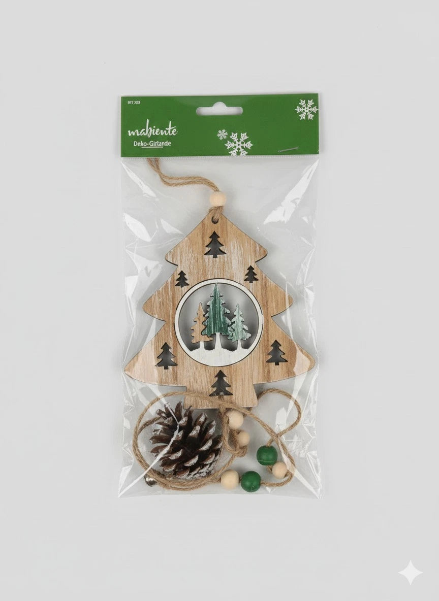 - Design: Eine liebevoll gestaltete Girlande, bestehend aus einem großen Holztannenbaum mit filigranen Ausschnitten, echten Kiefernzapfen und dekorativen Holzperlen.