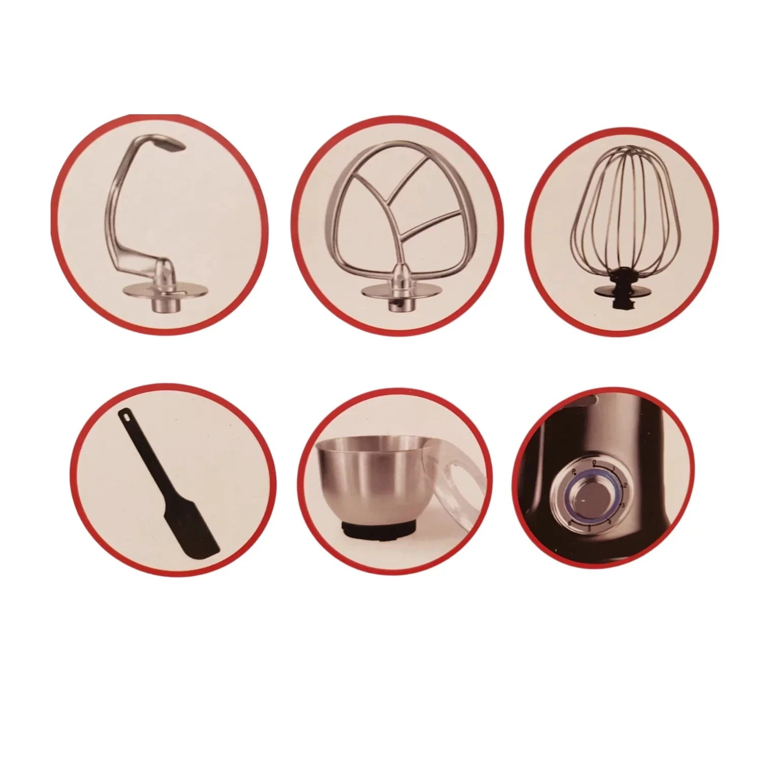 • Zubehör: Schneebesen, Knethaken, Rührer